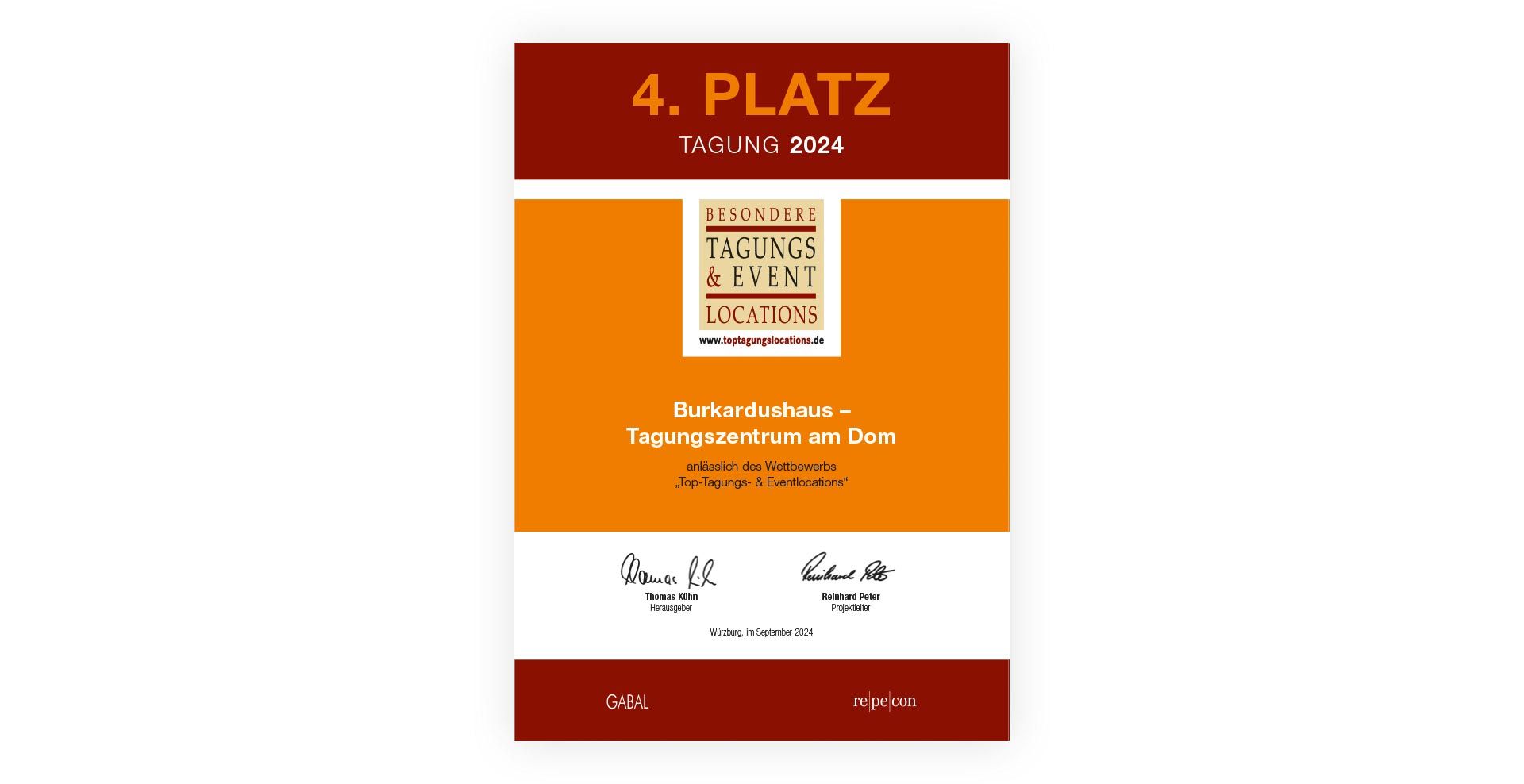 Das Burkardushaus wurde in der gleichen Kategorie auf Platz 4 gewählt und konnte sich somit im Vergleich zu 2023 um zwei Plätze verbessern. Das Burkardushaus besticht durch sein Flair, durch Service, Herzlichkeit, Gastfreundschaft und Professionalität. Zeitgenössische Kunstwerke unterstützen die Spiritualität des Hauses. Das Tagungshaus am Dom betreibt ein aktives Umweltmanagement. Ökologie und soziale Verantwortung sind feste Bestandteile der täglichen Arbeit.