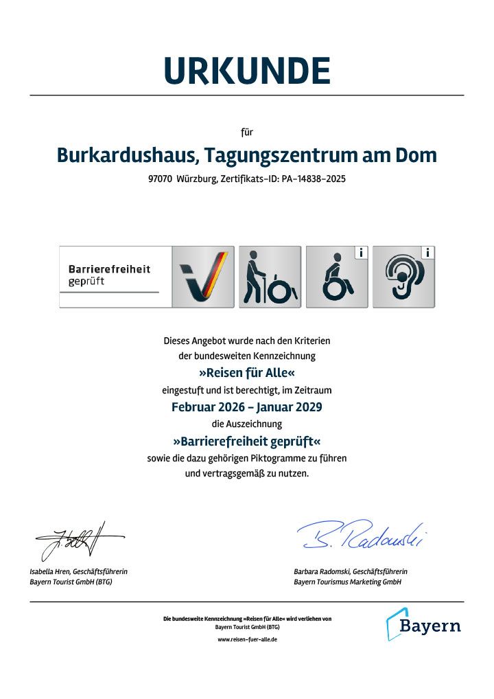 Das Burkardushaus erhält die Zertifizierung „Reisen für Alle“. Damit bestätigen unabhängige Prüferinnen und Prüfer die Barrierefreiheit unseres Hauses – ein wichtiger Schritt, um allen Gästen einen möglichst uneingeschränkten Aufenthalt zu ermöglichen.